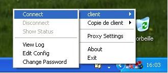 Le client OpenVPN est très facile à installer. Il faut que l'utilisateur récupère la clé, son certificat client, et le certificat de l'autorité de certification. La connexion s'établit en cliquant sur l'icône de OpenVPN, et une fois authentifié, le client accède à Internet et aux applications de la même manière que depuis son laboratoire d'appartenance.
