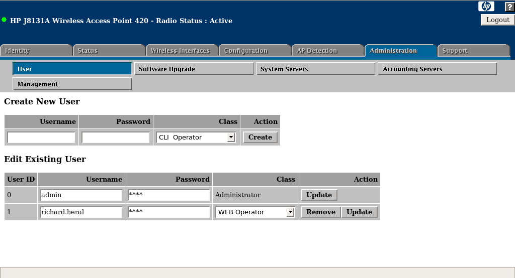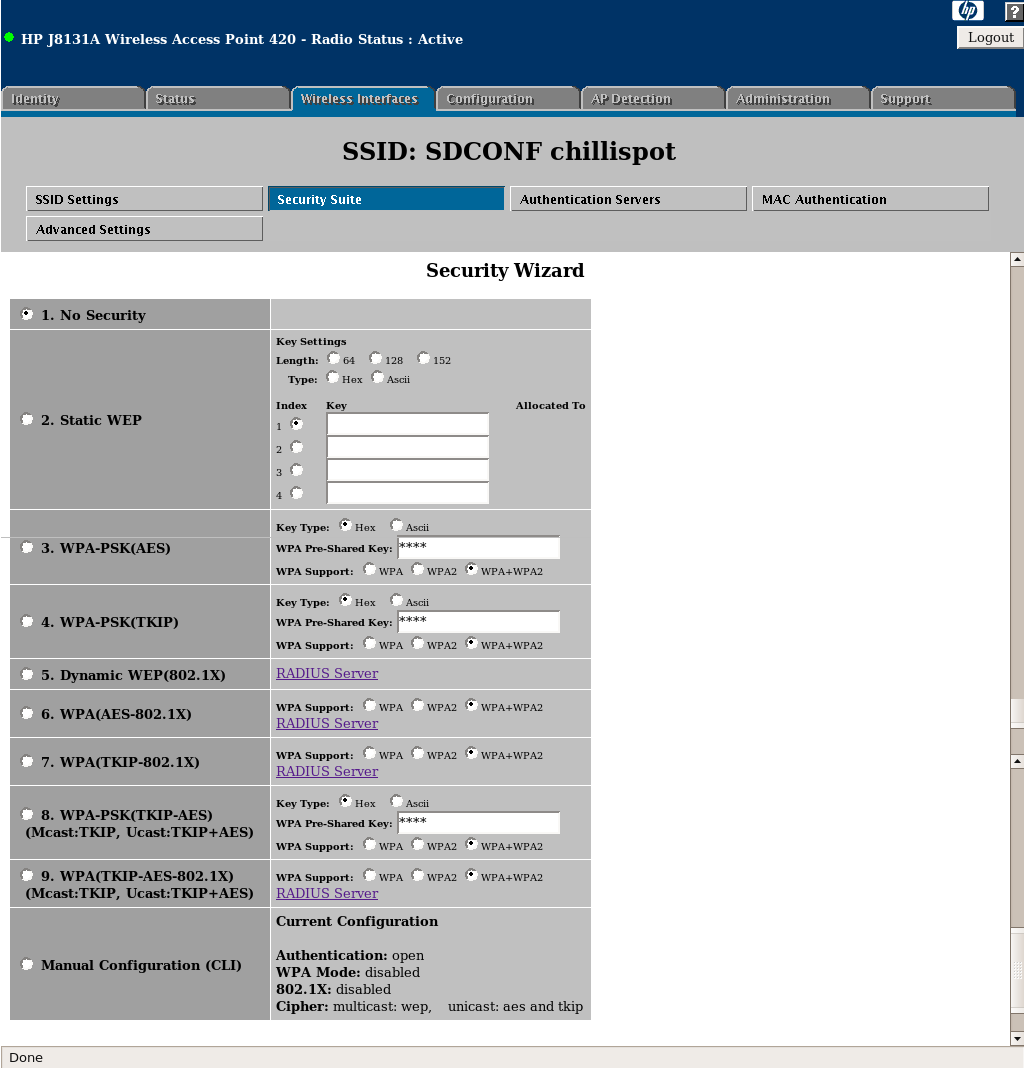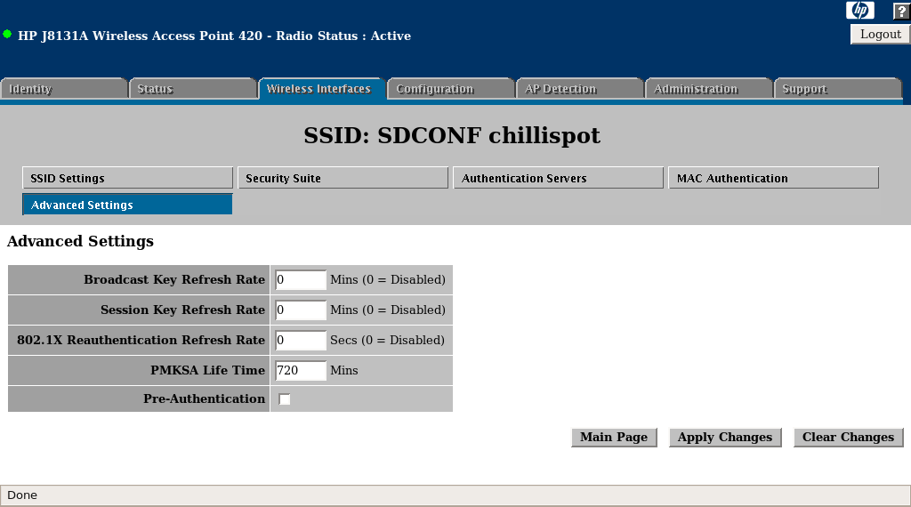Tout par défaut sauf "PMKSA life time" à 60 minutes, l'utilisateur devra resaisir la clée WPA2 |