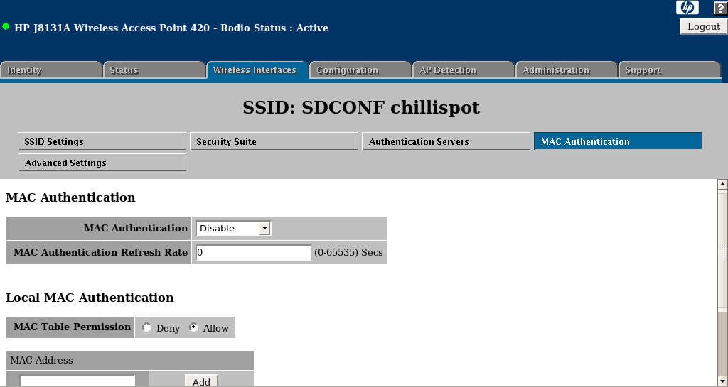 Il n'y a pas d'authentification par adresse MAC puisque l'usurpation de ces adresses se fait aujourd'hui très facilement |